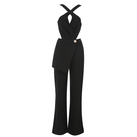 V-neck Sleeveless Back Hollow Out Button Business Women Sexy Jumpsuit