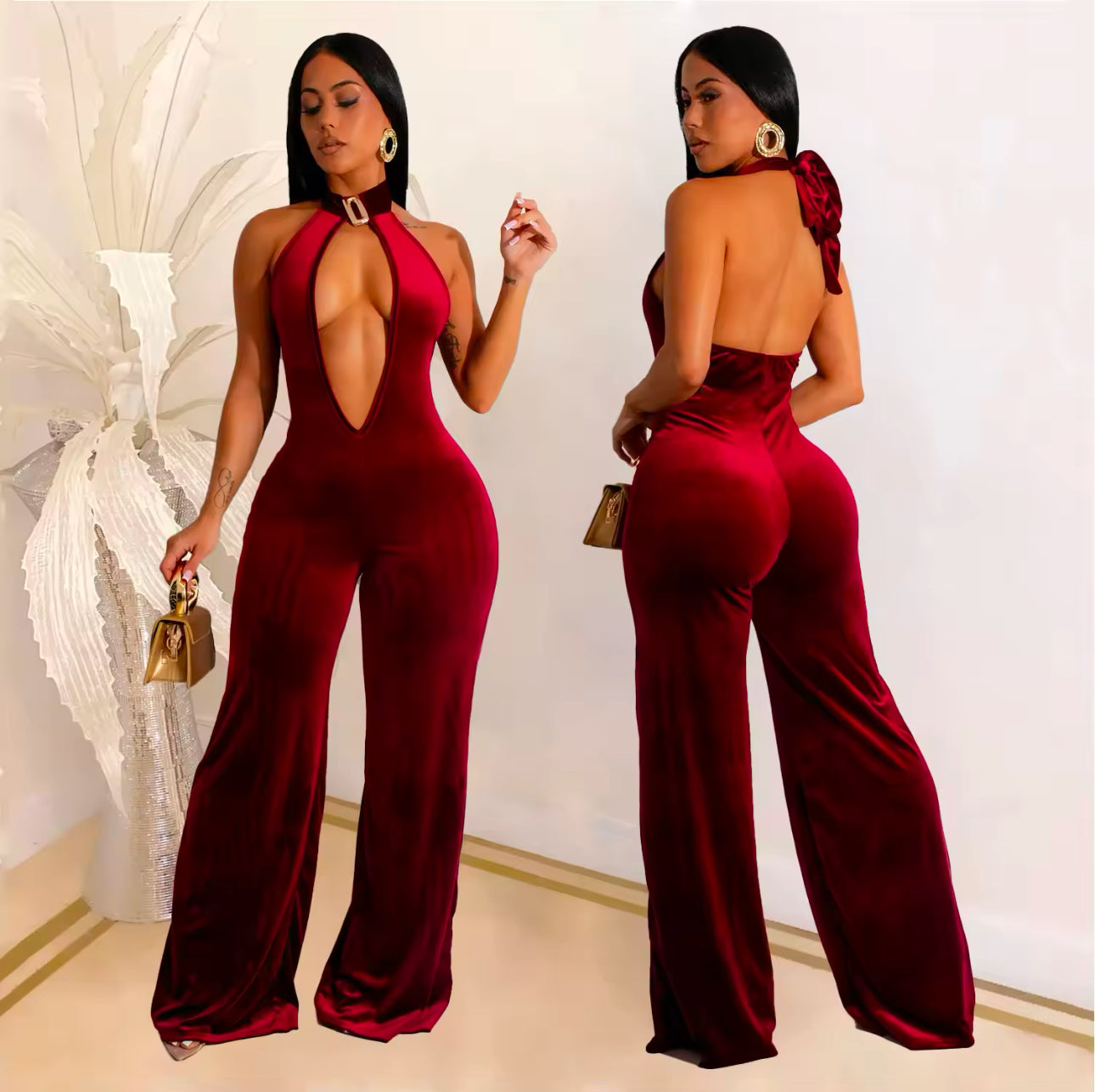 This velvet jumpsuit features a stylish key hole design, exuding sophistication and elegance. Crafted with soft velvet material, it provides ultimate comfort while making a fashion statement. Perfect for any formal event, elevate your wardrobe with this luxurious jumpsuit.